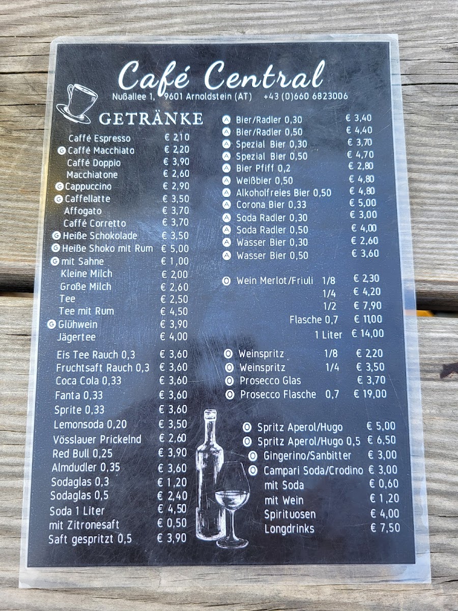 At Café Central, the menu comes across as concise yet thoughtfully curated, focusing on quality staples that suit a relaxed café experience. The beverage selection sets the tone, with Hirter Bier offering a clean, well-balanced Austrian brew that pairs effortlessly with casual conversation, while Espresso delivers a straightforward, robust profile for those who appreciate intensity in a small cup. Coffee lovers will likely gravitate toward Cappuccino Buono, which stands out for its smooth texture and harmonious balance between milk and espresso, making it ideal for lingering afternoons. To round things off, Tiramisu provides a familiar but satisfying dessert option, combining light creaminess with coffee-soaked layers that complement the drink menu rather than overpower it. Overall, the menu feels intentionally focused, prioritizing dependable classics over excess variety, which reinforces Café Central’s identity as a comfortable spot for both locals and travelers to enjoy reliable flavors without distraction.